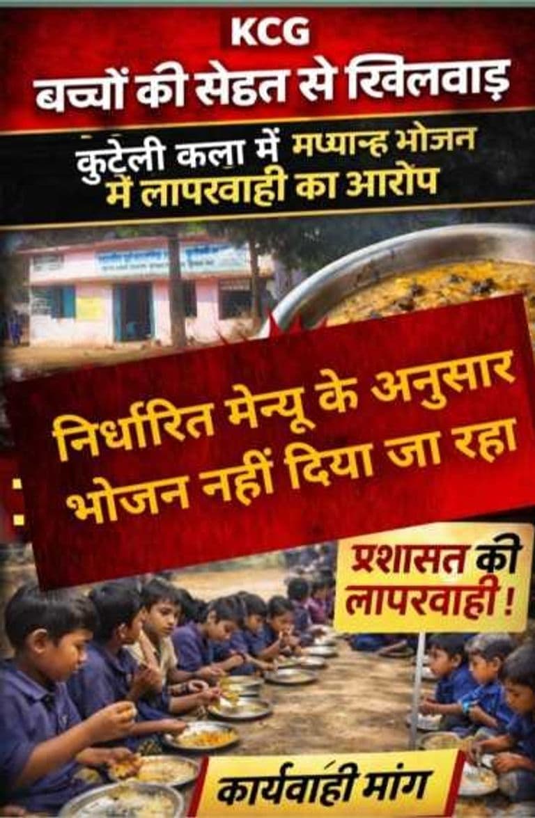 खैरागढ़ जिले के छुईखदान विकासखंड अंतर्गत ग्राम कुटेली कला में संचालित शासकीय पूर्व माध्यमिक शाला में मध्यान्ह भोजन व्यवस्था को लेकर गंभीर लापरवाही का मामला सामन...